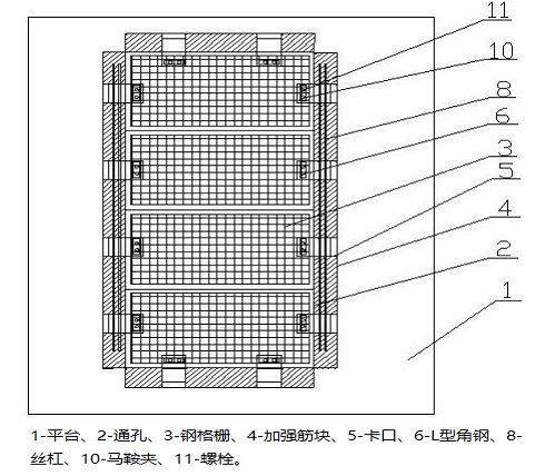 在平臺的通孔的四周點焊加強筋塊,增加了平臺承載受力面積,通過L型角鋼與加強筋塊的卡接形式以及絲杠的固定實現對L型角鋼的固定,避免L型角鋼直接與平臺焊接固定而引起角鋼、平臺以及角鋼與平臺連接處的應力集中、受力集中等缺陷,多個L型角鋼將受力分散至加強筋塊上,保證L型角鋼對鋼格柵及外界重力的承載力,同時加強筋塊通過點焊方式與平臺固定,減少一次焊接連接熱輸入產生的應力影響,減少平臺與加強筋塊連接處的變形及裂紋等焊接缺陷。