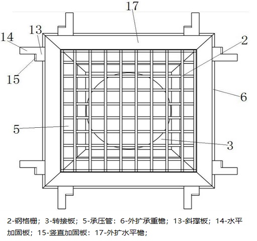 大流量工業用地漏預埋筋板包括斜撐板、設置在斜撐板上遠離鋼格柵安裝側框一端的水平加固板和豎直加固板。鋼格柵頂部設置有蓋板,鋼格柵安裝側框頂部設置有與混凝土地面齊平的外擴水平檐。泄水孔為拱形泄水孔,泄水管底部設置有用于與地下排水管路連接的法蘭盤。鋼格柵為正方形鋼格柵,正方形鋼格柵的邊長為440mm。