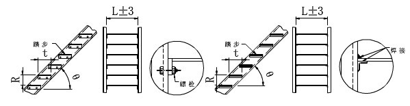 7、踏步板與梯梁的連接采用焊接或螺栓固定,如圖所示。采用螺栓固定時,螺栓規(guī)格不得小于M10。