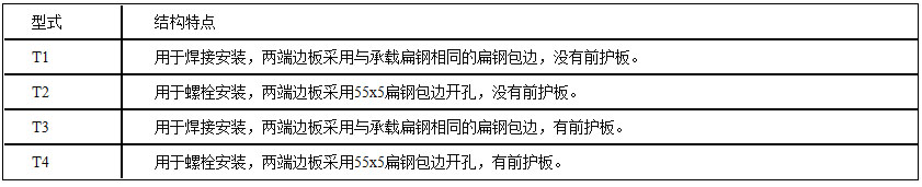 我廠生產(chǎn)的踏步板根據(jù)有無前護板和與梯梁聯(lián)接方式分為4種:T1,T2,T3,T4,踏步板型式見下圖: