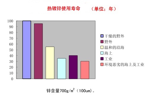 壓焊鋼格板表面熱鍍鋅處理,熱鋟鍍鋅是將普碳鋼或低合金結構鋼浸人熔融鋅浴中獲得具有熱鍍鋅層的鋼,主要用于鋼鐵的防大氣腐蝕.熱鍍鋅的優點在于其防腐能力強,鍍鋅層的附著力和硬度較好,有較長的使用壽命.熱鍍鋅層厚100um時產品在以下各種環境中的壽命見圖3.同時,熱鋟鍍鋅碳鋼產品在PH值6~12.5范圍內,鋅層表面形成的保護膜,抗腐蝕性能較好,經熱鍍鋅處理的鋼格板,使用壽命至少30年免維護。