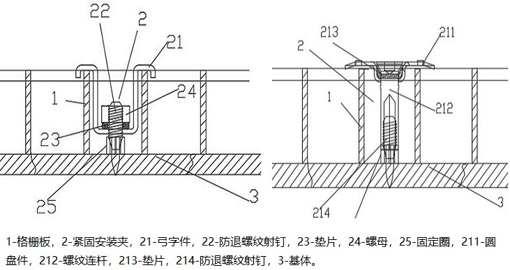 鋼格柵板射釘緊固安裝夾,包括:鋼格柵板、緊固安裝夾和基體;在基體的上端設(shè)置鋼格柵板;鋼格柵板通過(guò)緊固安裝夾固定在基體上。緊固安裝夾包括弓字件、防退螺紋射釘、墊片、螺母和固定圈;弓字件的兩端分別搭設(shè)在鋼格柵板的上端;弓字件的中部設(shè)置防退螺紋射釘,且防退螺紋射釘?shù)牡锥舜┻^(guò)弓字件固定在基體上;在防退螺紋射釘?shù)纳隙颂籽b有墊片,并且在墊片上端的防退螺紋射釘上安裝螺母;固定圈套設(shè)在防退螺紋射釘?shù)牡锥恕9旨山饘俨牧现瞥桑瑝|片由PCV材料制成。
